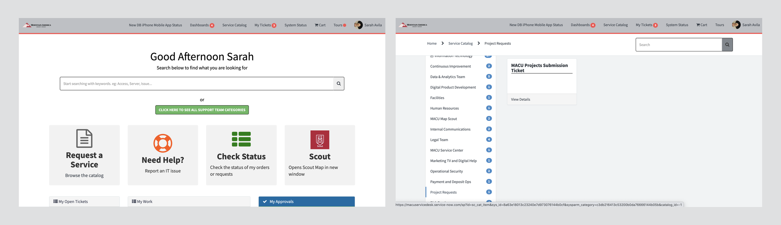 Catalog access and ticket submission area where users could browse services and submit new tickets.